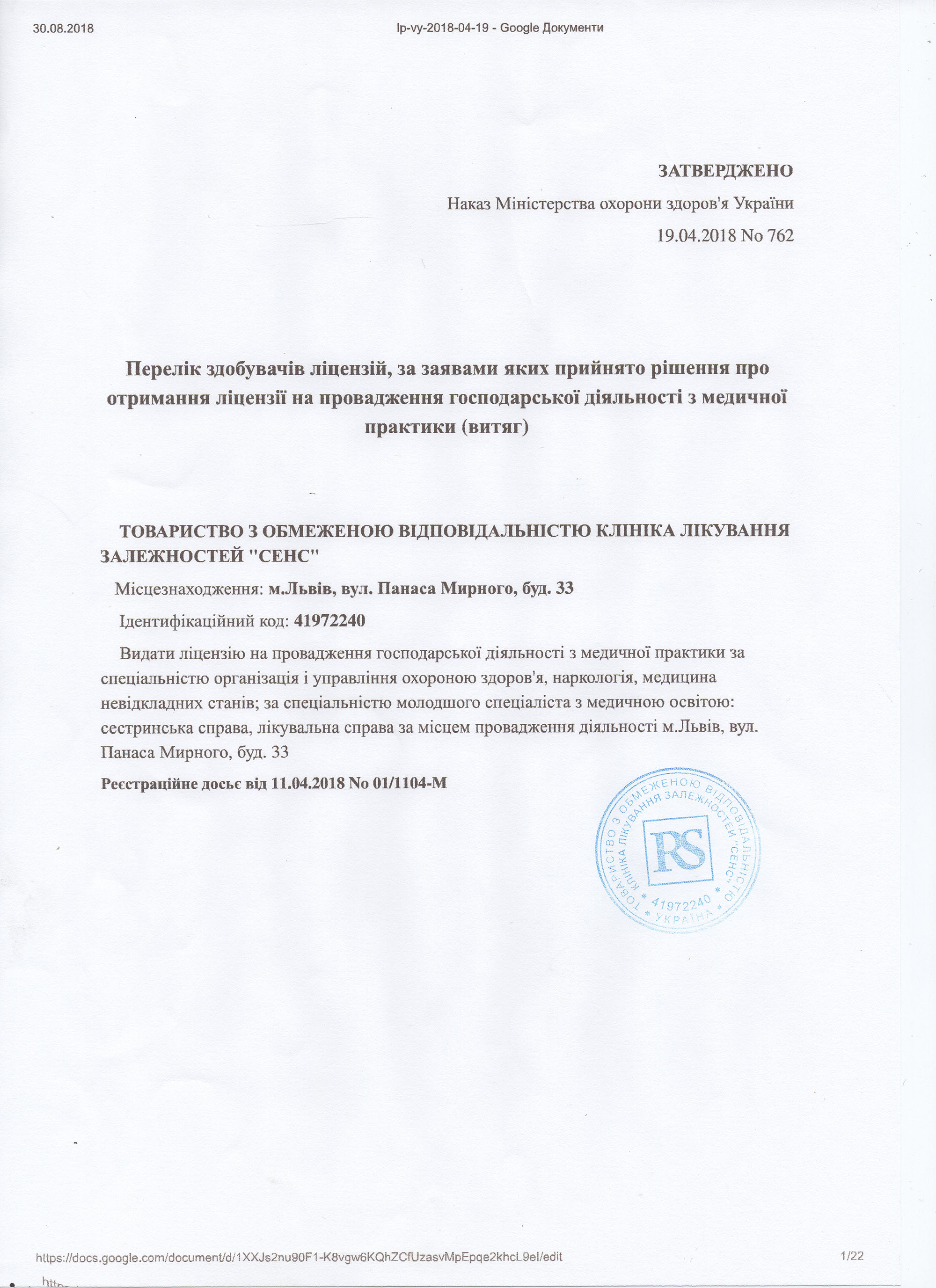 Медичні послуги надаються згідно ліцензії МОЗ